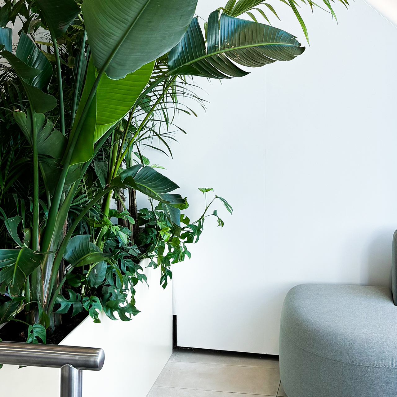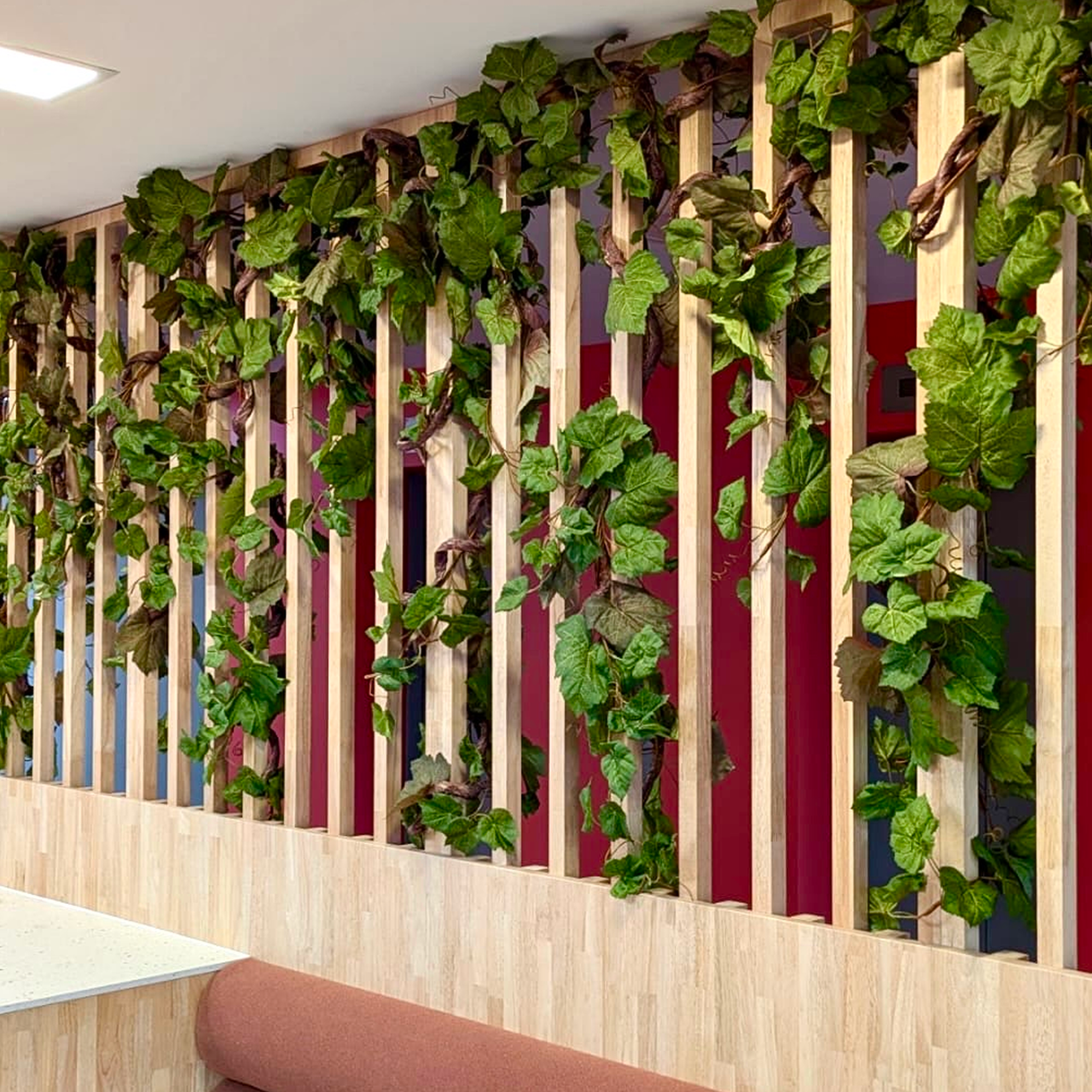 Pour ce chantier, nous avons imaginé un aménagement végétal hybride, alliant plantes naturelles et végétation artificielle dans les zones peu lumineuses, afin d’offrir une solution esthétique, durable et adaptée à l’usage des espaces.