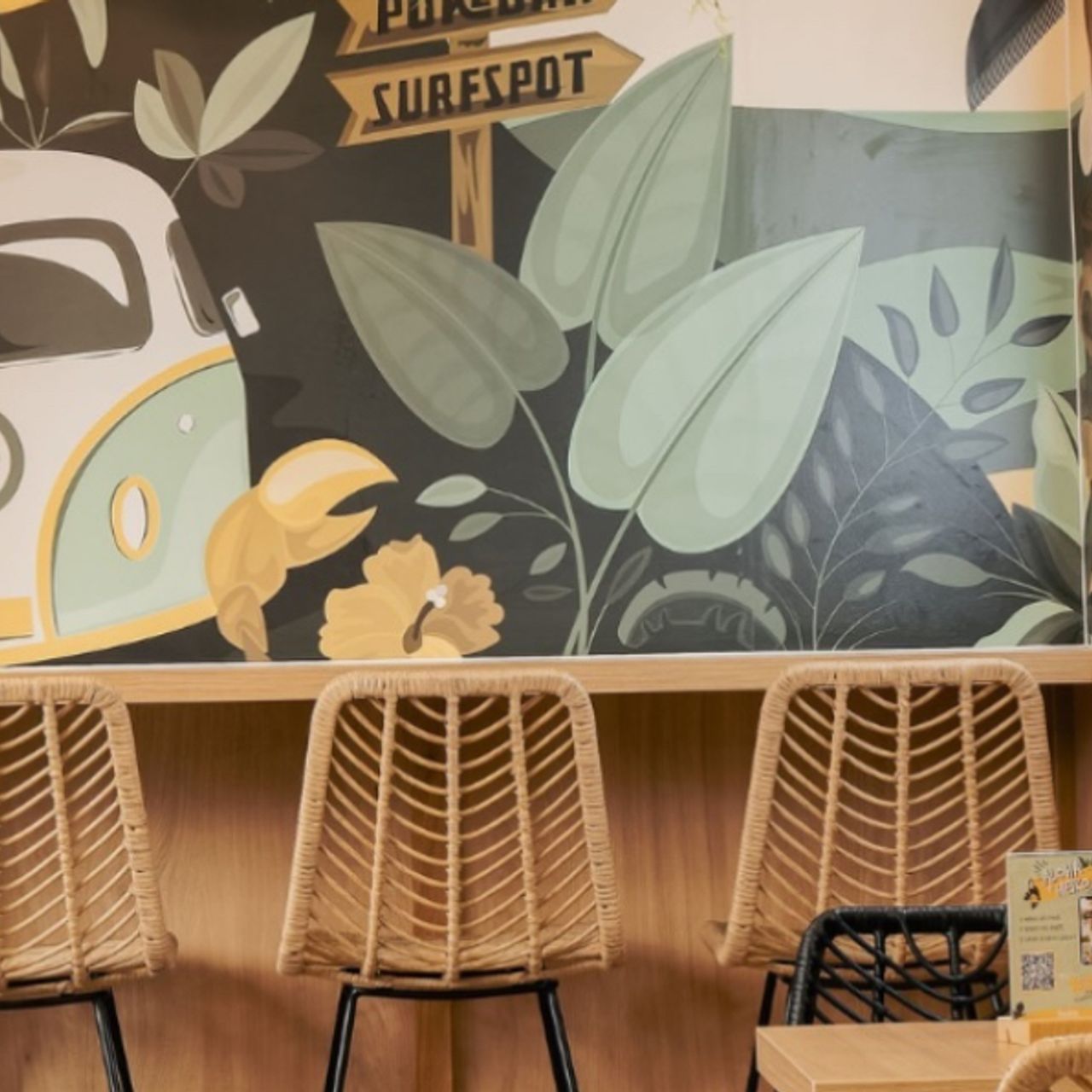 • Un arbre sur mesure type olivier, réalisé dans nos ateliers à Bordeaux à partir de bois flotté collecté sur le bassin d’Arcachon, et intégré dans une table conçue par Caractère Bois – pièce unique et centrale de l’espace.
